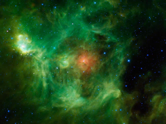 deren Zusammensetzung sehr ähnlich ist Smog hier auf der Erde gefunden hat. Die rote Wolke (Bug) in der Mitte ist wohl der Staub, desto metallischer und kühler als die umliegenden Regionen ist. Der helle Stern in der Mitte der roten Wolke, genannt HD 278942 ist so hell, dass es wahrscheinlich ist, was die Ursache die meisten der umliegenden Ring zu glühen. In der Tat seinen starken stellaren Winde sind das, was ausgeräumt der umgebenden warmen Staub und erstellt die ringförmige Funktion in den ersten Platz. Die hellen grünlich-gelb Region Mitte (Stechpalme) links ist ähnlich wie der Ring, wenn auch dicht. Die bläulich-weiße Sterne (Silver Bells) verstreut Sterne sowohl vor befinden, und hinter dem Nebel.